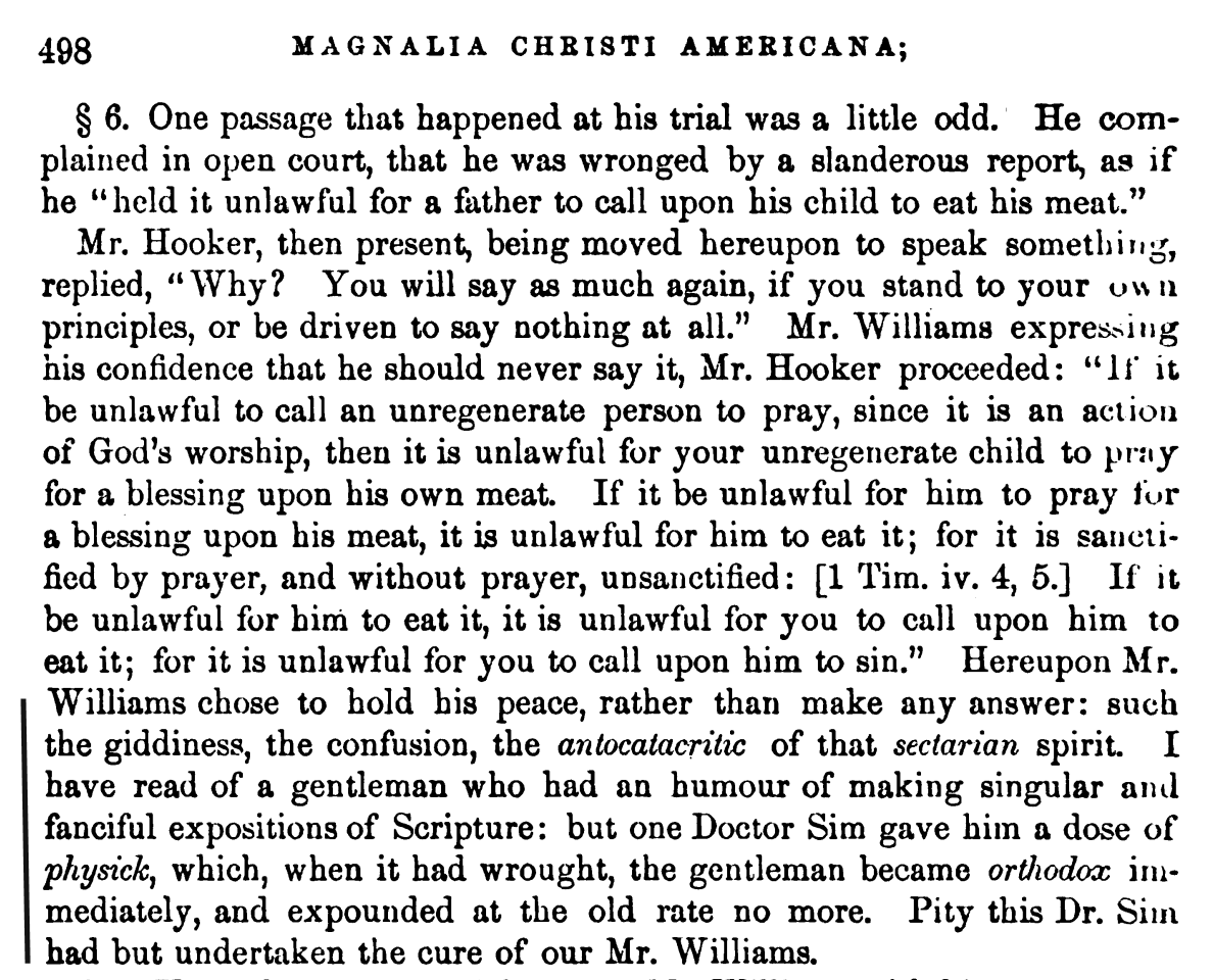 So I was reading Cotton Mather’s narrative of troubled Roger Williams, whom the Boston magistrates exiled because he had made such a nuisance of himself up that way. I found the following humorous—and enlightening! I’m sure Mather hardly meant to suggest that all of Roger William’s problems were mental. But it sure seems like he thinks something was amiss and needed treatment.