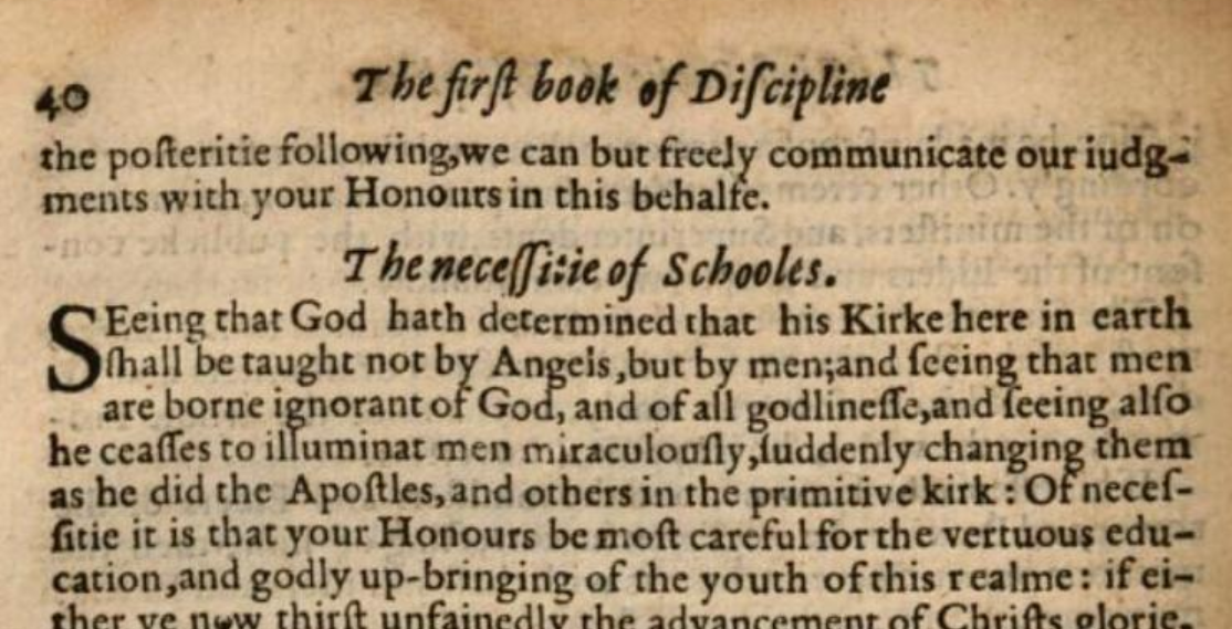 Seeing that God has determined that his church here in earth shall be taught not by angels but by men; and seeing that men are born ignorant of all godliness; and seeing, also, God now ceases to illuminate men miraculously, suddenly changing them, as that he did his apostles and others in the primitive church: of necessity it is that your honours be most careful for the virtuous education and godly upbringing of the youth of this realm, if either ye now thirst unfeignedly [for] the advancement of Christ’s glory, or yet desire the continuance of his benefits to the generation following. For as the youth must succeed to us, so we ought to be careful that they have the knowledge and erudition to profit and comfort that which ought to be most dear to us-to wit, the church and spouse of the Lord Jesus.
