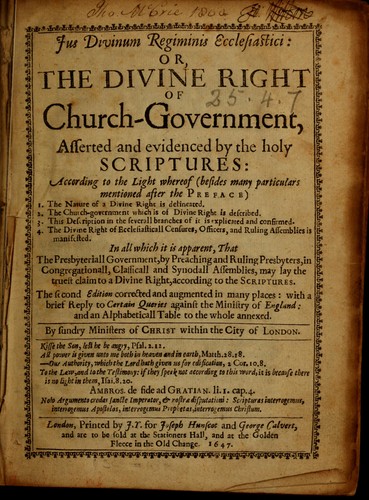 “Arguably the best biblical defenses of presbyterian ecclesiology and explanations of its polity were produced in the seventeenth century. Among these, none has a reputation better than an English work with the Latin title Jus Divinum Regiminis Ecclesiastici, with the English subtitle The Divine Right of Church Government. In three successive editions, two of which were penned during the time that the Westminster Assembly met, ‘sundry’ London ministers laid out their case. In the first part of the book they demonstrate that there is a government of the church established and revealed by God. In the second part of the book they describe that government, explain its benefits to God’s people, and further develop the biblical and theological justifications for presbyterianism.