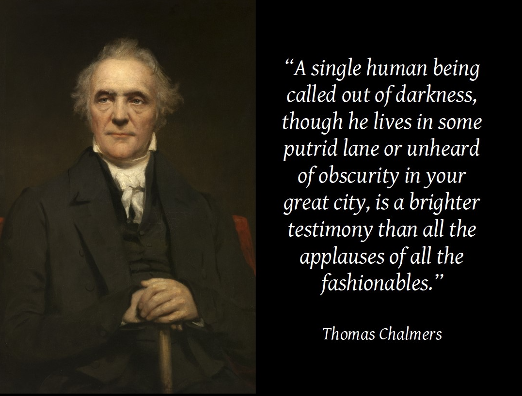 “For the accomplishment of this, there must not only be a going forth on the vast and untrodden spaces that are without; there must be a filling up of the numerous and peopled vacancies that are within—a busy, internal locomotion, that might circulate, and disperse, and branch off to the right and to the left, among the many thousand families which are at hand: and thoroughly to pervade these families; to make good a lodgment in the midst of them, for the nearer or the more frequent ministrations of Christianity than before; to have gained welcome for the Gospel testimony into their houses, and, in return, to have drawn any of them forth to attendance on the place of Sabbath and of solemn services—this, also, is to act upon our text, this is to do the part, and to render one of the best achievements of a missionary.”