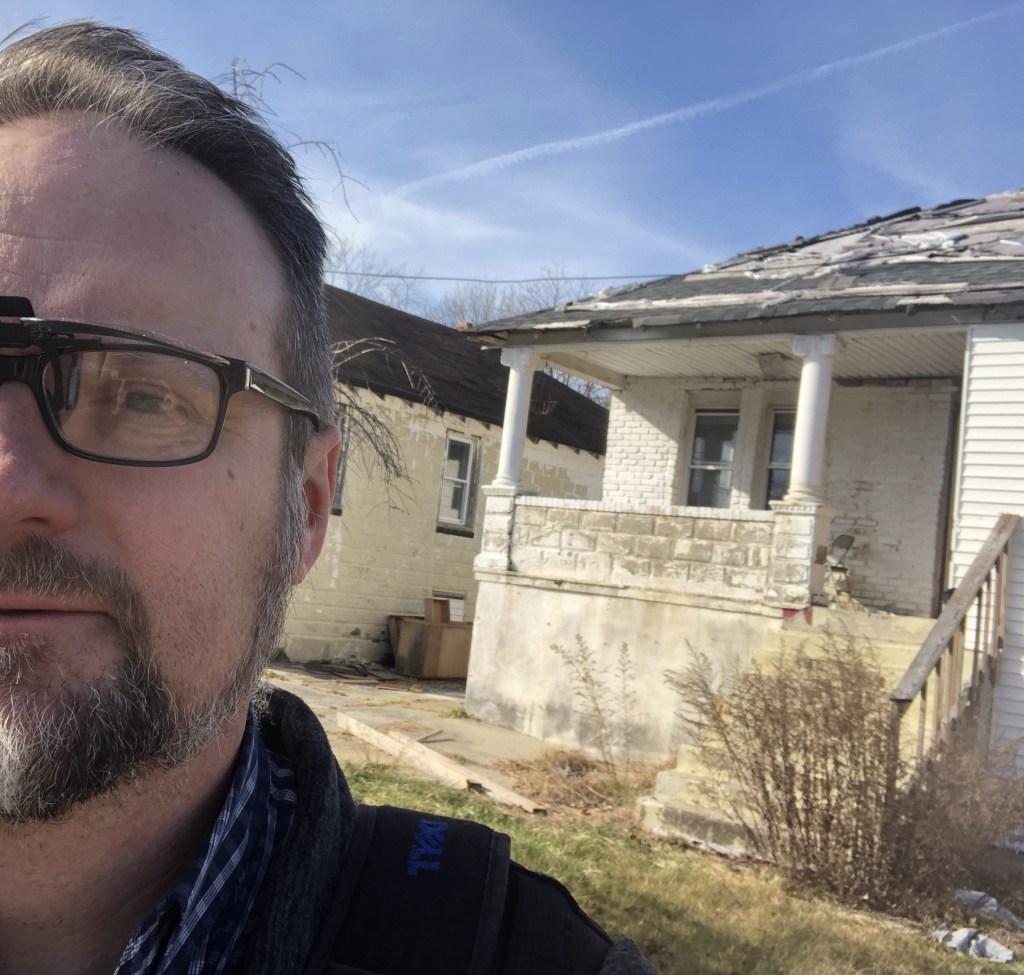 Over the last few weeks, I’ve made more progress door-to-door in Woodbine. It’s got some character to be sure. There are some nice, even stately old homes alternating with run-down and abandoned shells. The one below had the front door completely knocked in to the ground. With poorer judgment, I could have just walked throughout the place.