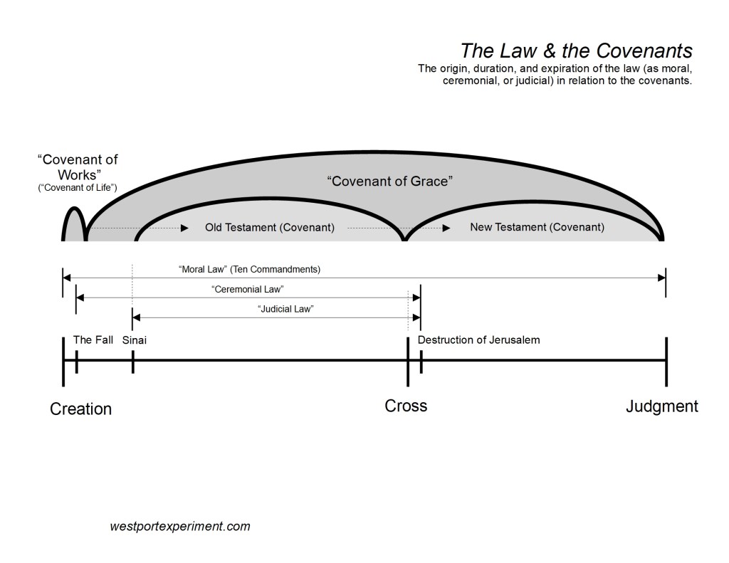 Much of this is self-explanatory for those with a working knowledge of Reformed doctrine. But a bit of clarification on my design. I added a dashed, horizontal line & arrow from Covenant of Works moving through the OT and NT dispensations to help reduce the impression that it is somehow a cipher after the Fall. I also configured the OT period to begin at Sinai (as technically it does), though canonically it usually embraces everything from Genesis to Malachi. Third, the dashed, vertical line above Sinai intersecting the horizontal lines of the Moral and Ceremonial law is intended to reflect the development and institutionalization of the latter and the explicit publication of the former. Last, the dashed and hard vertical lines at the cross represent the distinction between the definitive abolition of these laws at 33(-ish) A.D. and their actual, outward end with the destruction of the Temple and Jerusalem in 70 A.D.
