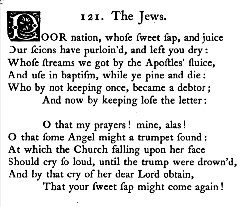 “For if thou wert cut out of the olive tree which is wild by nature, and wert graffed contrary to nature into a good olive tree: how much more shall these, which be the natural branches, be graffed into their own olive tree” (Romans 11:24). This poem of Herbert beautifully and tenderly expresses the right attitude of the believing Gentiles toward the disinherited Jews, with Pauline longings for their final restoration by repentance and faith in their own, rejected Messiah.